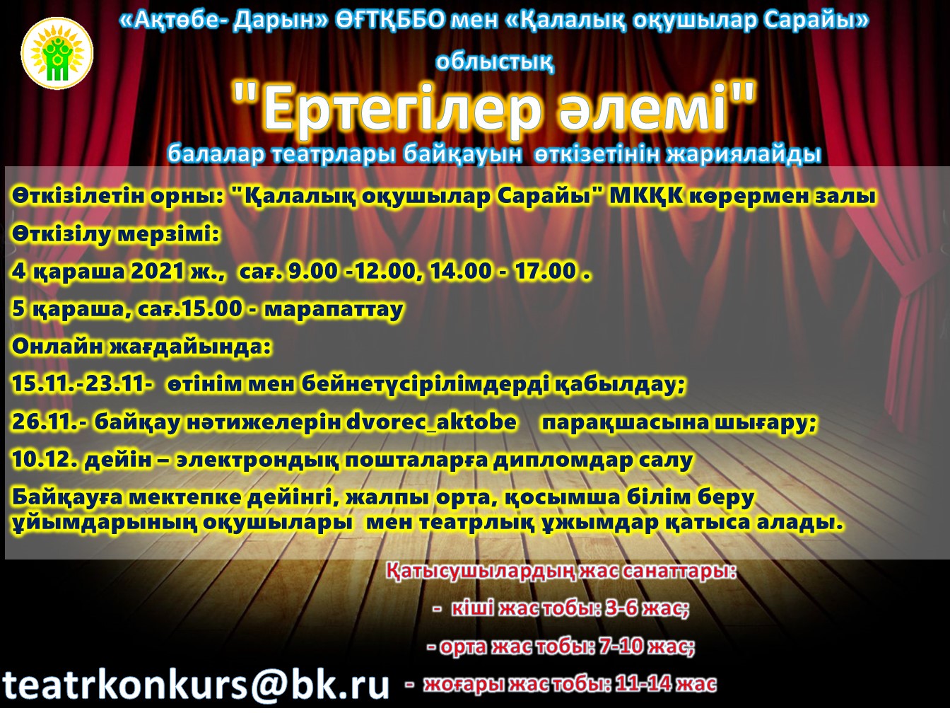 2021 ж. 15-23.11. аралығында «Ақтөбе-Дарын» ӨҒТҚББО мен «Қалаллық оқушылар Сарайы» МКҚК Қазақстан Республикасының Тәуелсіздігінің 30-жылдығына арналған «Ертегілер әлемі» атты облыстық балалар театрлары байқауын өткізді