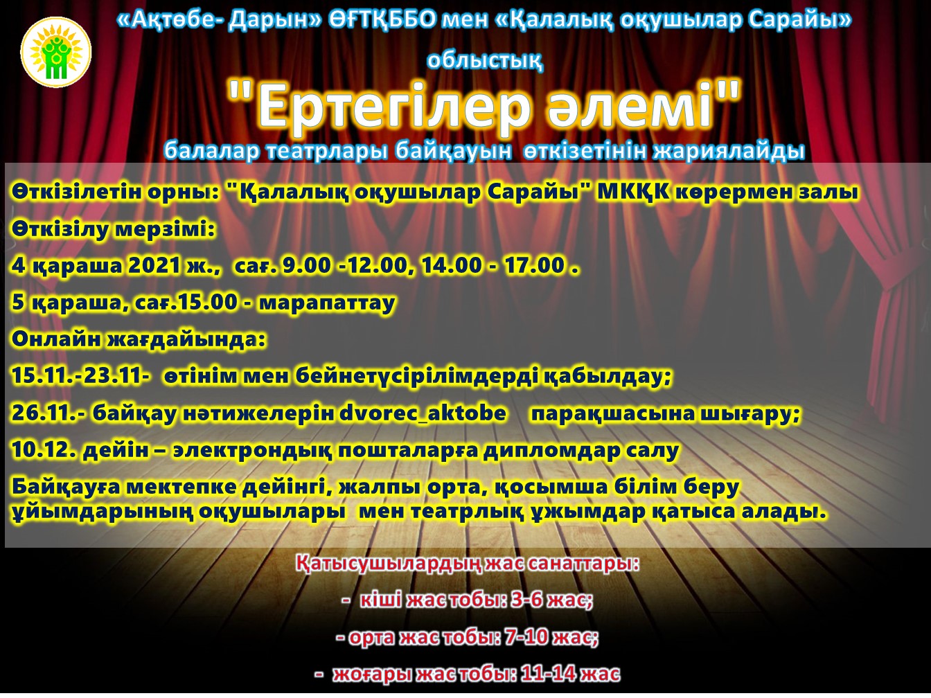 «Ақтөбе- Дарын» ӨҒТҚББО мен «Қалалық оқушылар Сарайы» «ертегілер әлемі» облыстық " Ертегілер әлемі" балалар театрлары байқауын өткізетінін жариялайды.