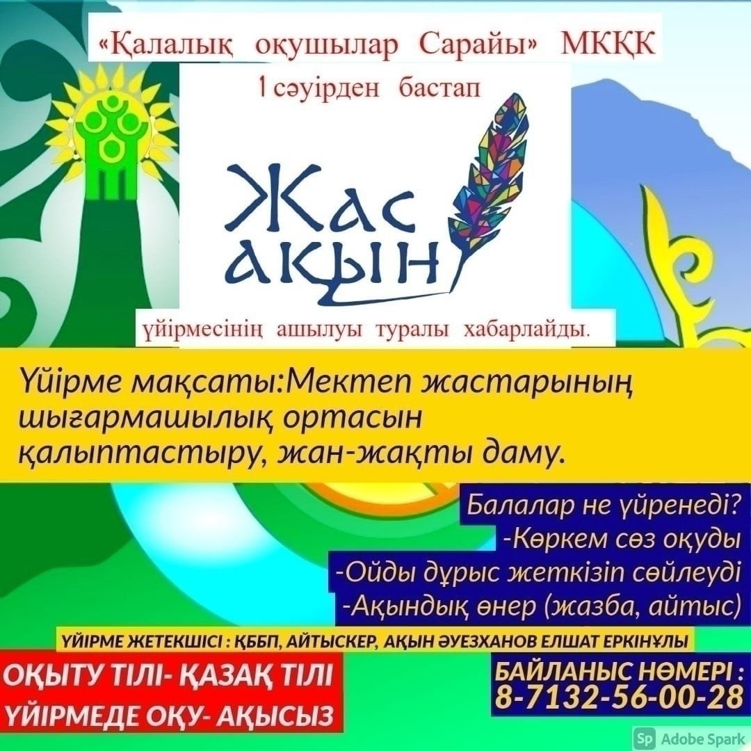 1 сәуірден бастап «Қалалық оқушылар Сарайы» МКҚК «Жас ақын» үйірмесінің ашылуы туралы хабарлайды.