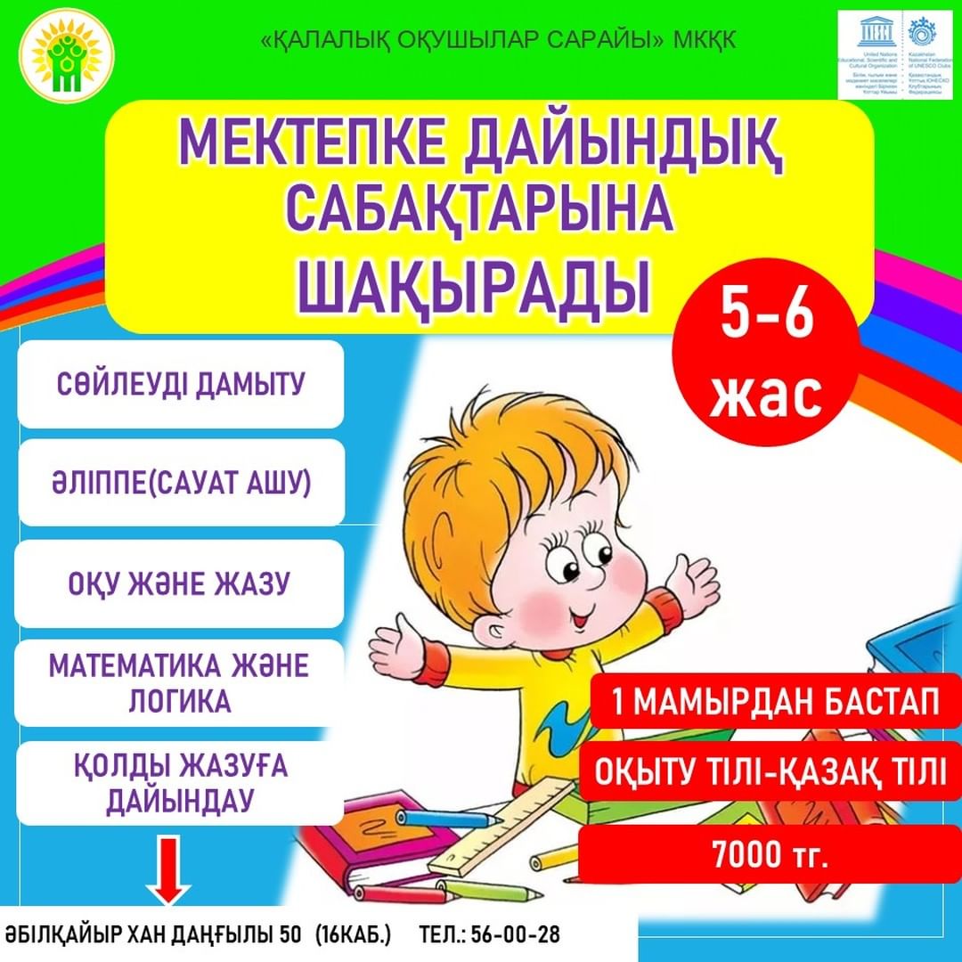 Оқушылар сарайы мектепке дайындық сабақтарына шақырады. Оқыту мемлекеттік тілінде өтеді.