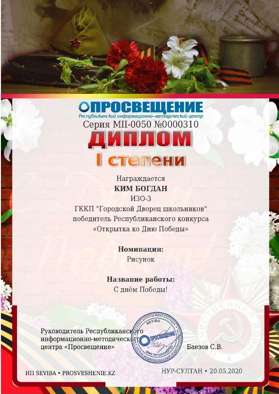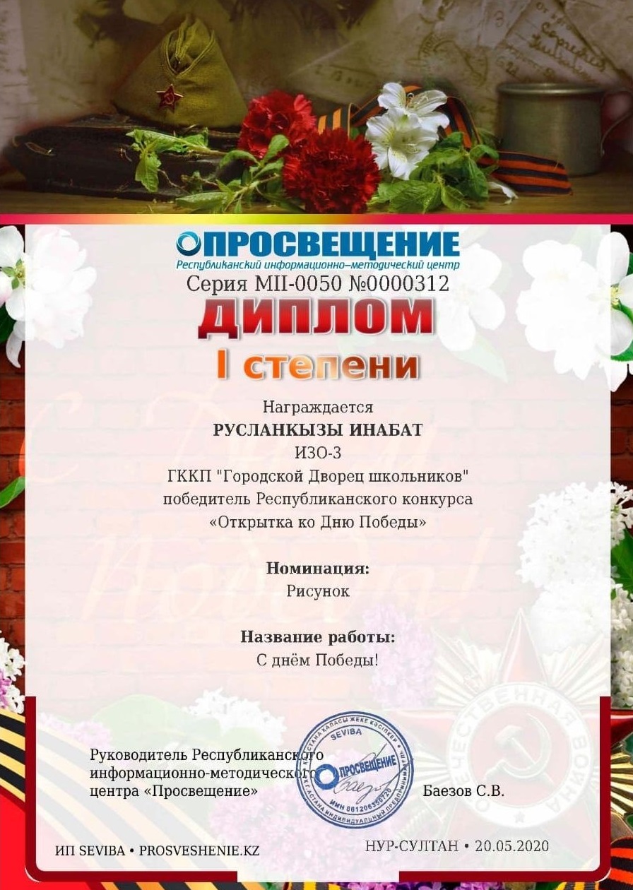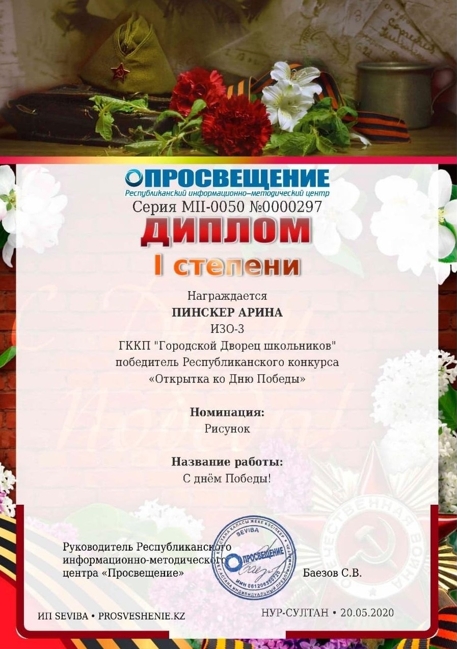 Қалалық оқушылар Сарайының бейнелеу студиясының 7 оқушысы "Открытка ко Дню победы"Республикалық байқауында І Дәрежелі Лауреат атанды. Митрохина Виолетта, Федорова Алена,Пинскер Арина,Ким Богдан, Русланқызы Инабат- педагог Ю.С. Зорина. Және педагог М.Е. Шауменованың білім алушылары Қажымұрат Жұлдыз бен Жоламан Айжанарлым.