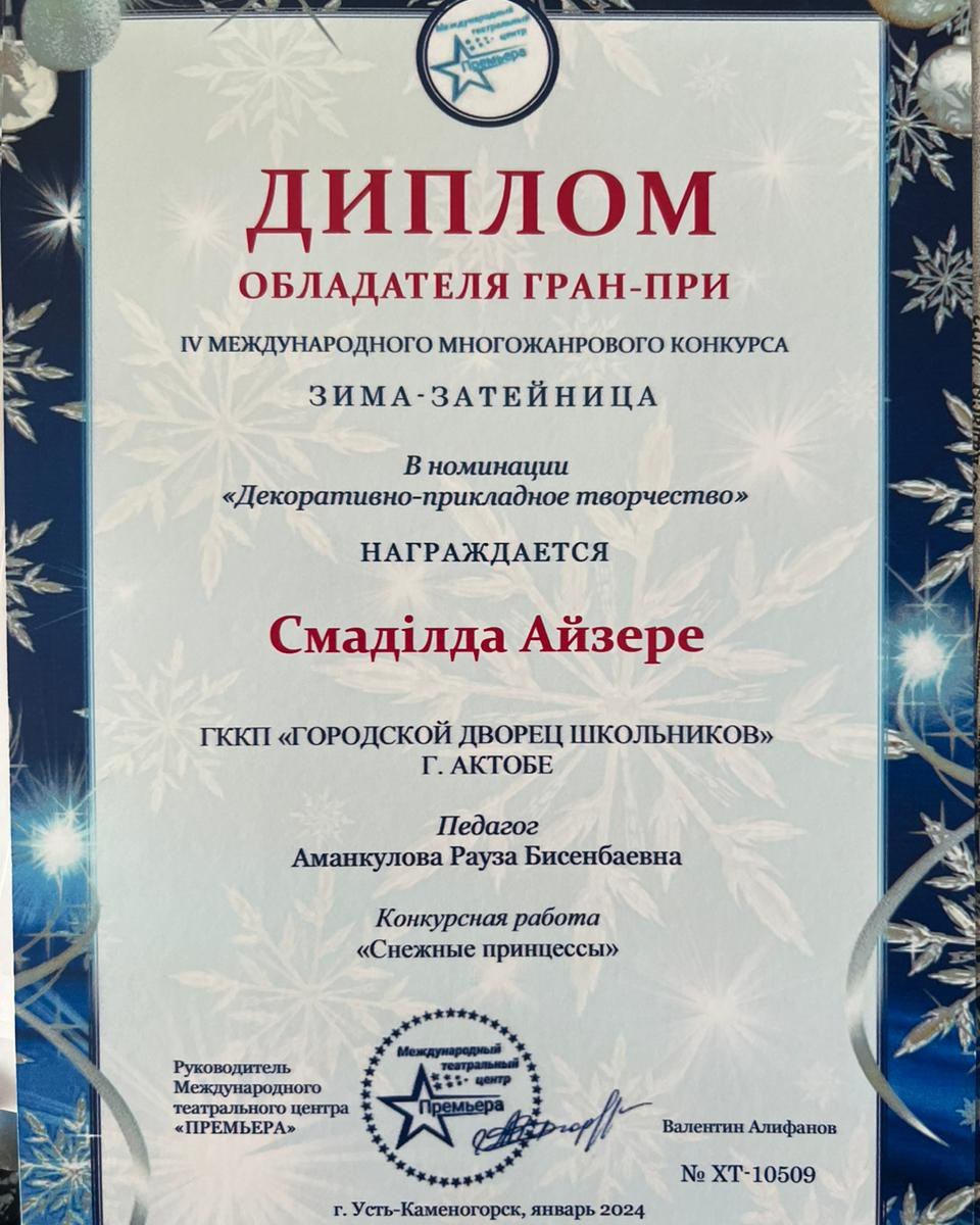 Өскемен қаласында өткен ІV халықаралық көпжанрлық «Зима-Затейница» конкурсына қатысып «Қалалық оқушылар Сарайы» МКҚК «Қолдаңбалы» факультетінің тәрбиеленушілері Смаділдә Айзере және Абрашева Дина Гран При иеленді.Жетекшісі:Аманкулова Рауза Бисенбаевна. Құттықтаймыз!